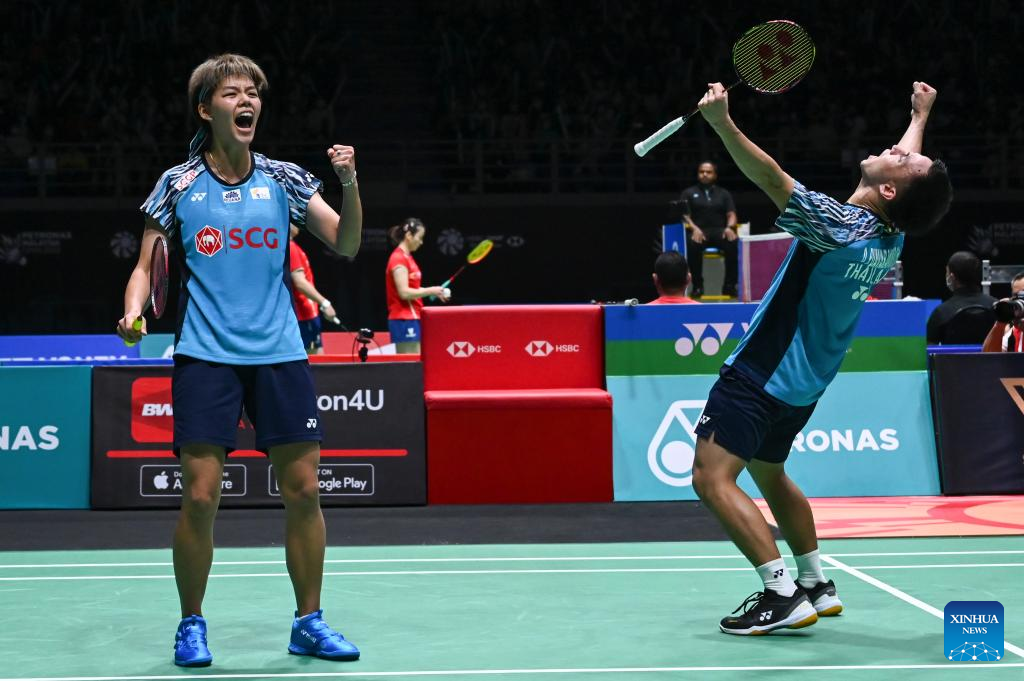 Dechapol Puavaranukroh (R)/Sapsiree Taerattanachai celebrate victory after winning the mixed doubles semifinal match between Wang Yilyu/Huang Dongping of China and Dechapol Puavaranukroh/Sapsiree Taerattanachai of Thailand at Malaysia Open 2022 badminton tournament in Kuala Lumpur, Malaysia, July 2, 2022. (Xinhua/Zhu Wei)