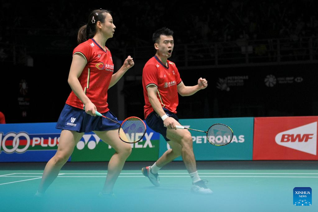 Zheng Siwei (R)/Huang Yaqiong celebrate scoring during the mixed doubles semifinal match between Zheng Siwei/Huang Yaqiong of China and Mathias Christiansen/Alexandra Boje of Denmark at Malaysia Open 2022 badminton tournament in Kuala Lumpur, Malaysia, July 2, 2022. (Photo by Chong Voon Chung/Xinhua)