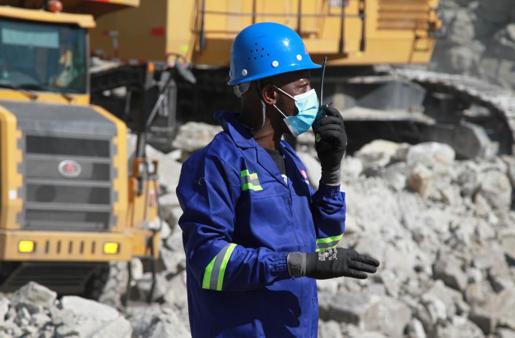 Panashe Shayawabaya, a Chinese language interpreter, speaks through a walkie-talkie at a mining site in Hwange, Matebeleland North Province, Zimbabwe, on June 13, 2022. (Photo by Tafara Mugwara/Xinhua)