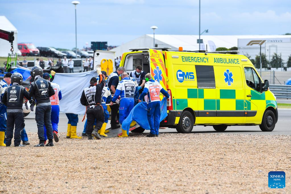 Alfa Romeo's Chinese driver Zhou Guanyu receives medical treatment as he is stretchered off after a crash at the start of the Formula One British Grand Prix at the Silverstone motor racing circuit in Silverstone, Britain, on July 3, 2022. (Photo by Qian Jun/Xinhua)