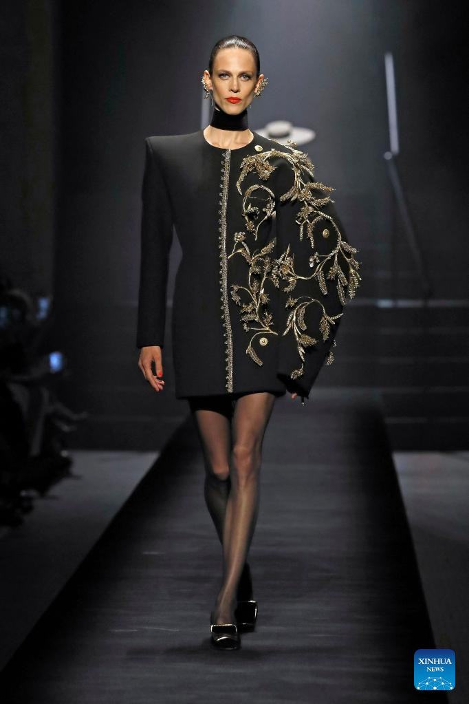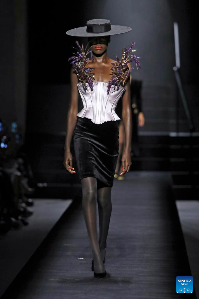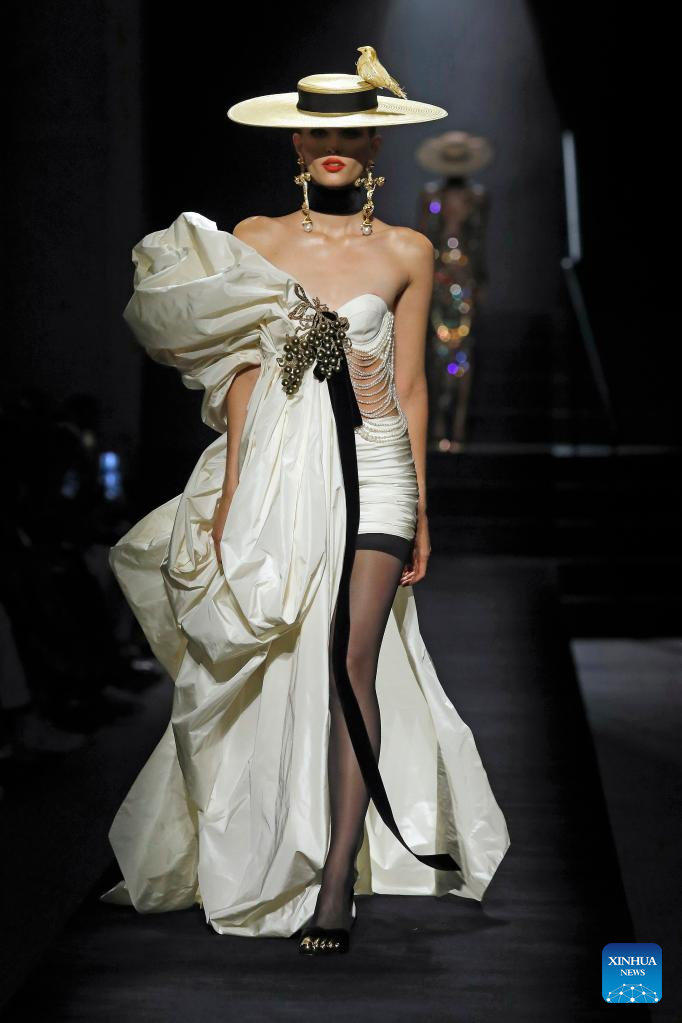 A model presents a creation from the Fall/Winter 2022-2023 Haute Couture collection of Schiaparelli during the Paris Fashion Week in Paris, France, on July 4, 2022. (Photo by Piero Biasion/Xinhua)