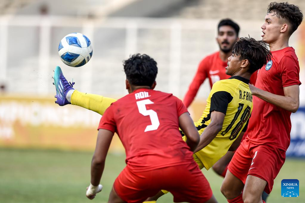 Adam Farhan (C) of Malaysia vies with Danial Scott of Singapore during their Group B match of the AFF U-19 Youth Championship at Madya Stadium in Jakarta, Indonesia. July 7, 2022. (Xinhua/Agung Kuncahya B.)