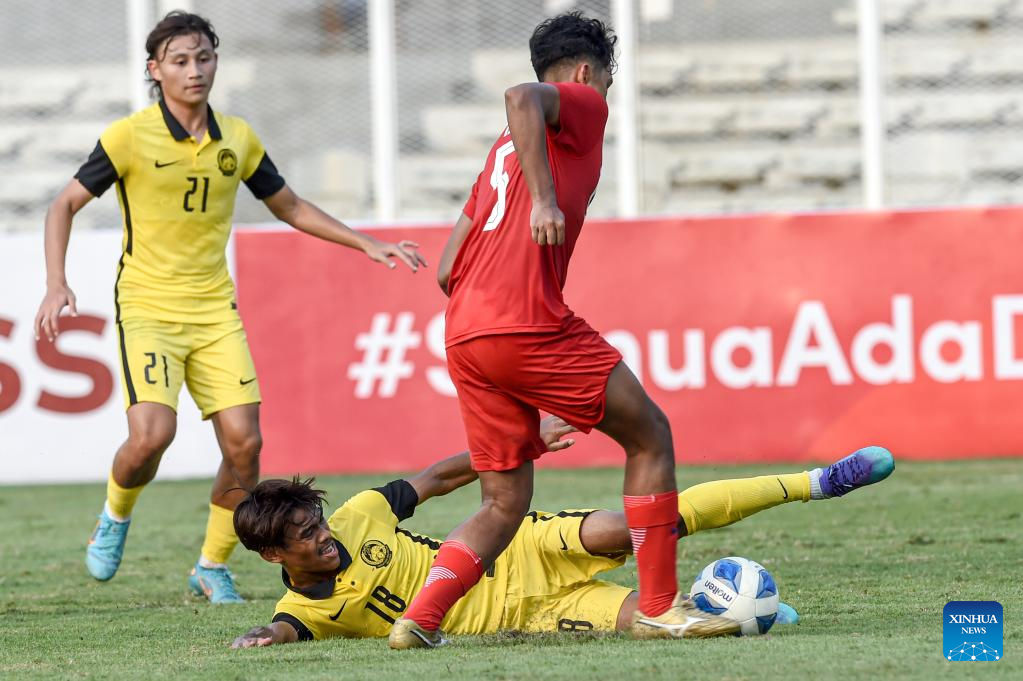 Adam Farhan (bottom) of Malaysia vies with Muhammad Aqil of Singapore during their Group B match of the AFF U-19 Youth Championship at Madya Stadium in Jakarta, Indonesia. July 7, 2022. (Xinhua/Agung Kuncahya B.)