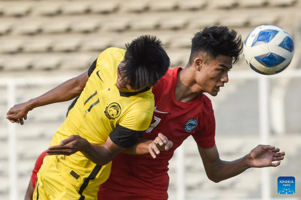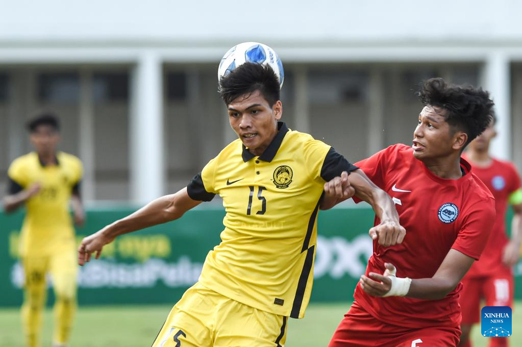 Azannis Adzi (L) of Malaysia vies with Muhammad Aqil of Singapore during their Group B match of the AFF U-19 Youth Championship at Madya Stadium in Jakarta, Indonesia. July 7, 2022. (Xinhua/Agung Kuncahya B.)