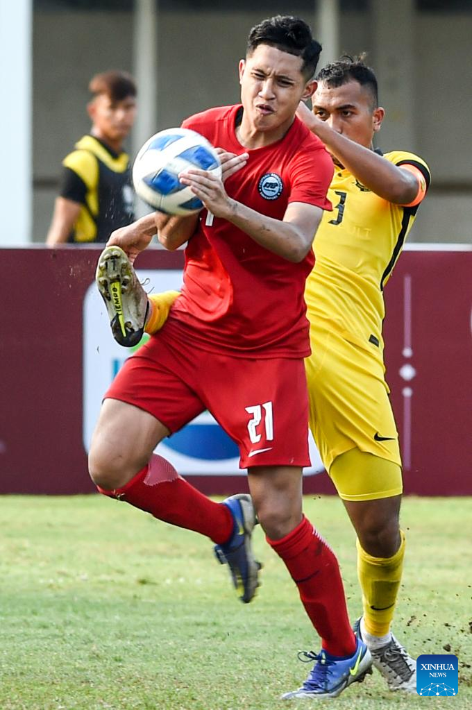 Muhammad Ubaidullah (R) of Malaysia vies with Ryu Hardy of Singapore during their Group B match of the AFF U-19 Youth Championship at Madya Stadium in Jakarta, Indonesia. July 7, 2022. (Xinhua/Agung Kuncahya B.)