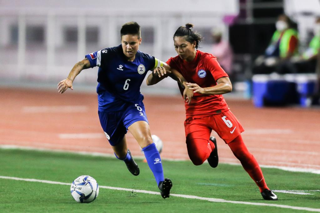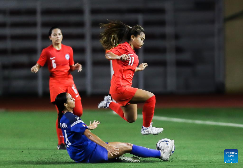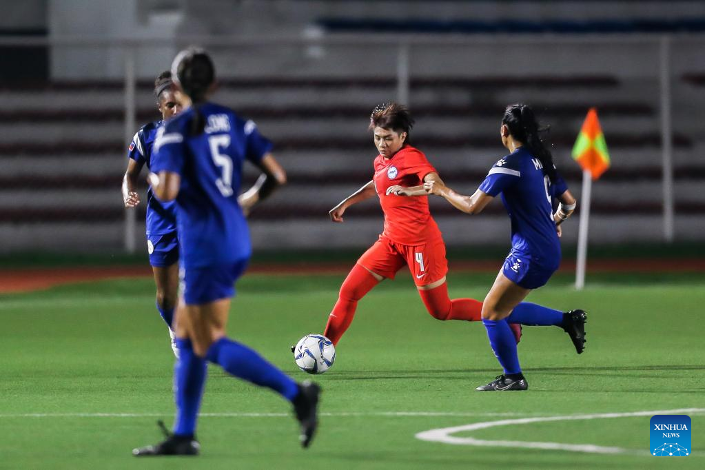 Singapore's Stephanie Gigette Dominguez (2nd R) competes during the AFF Women's Championship 2022 Group A match between the Philippines and Singapore in Manila, the Philippines on July 6, 2022. (Xinhua/Rouelle Umali)