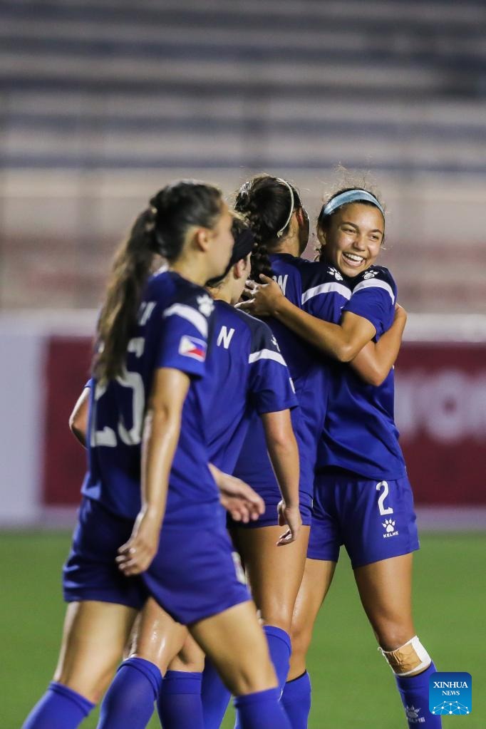 Players of the Philippines celebrate after scoring a goal during the AFF Women's Championship 2022 Group A match between the Philippines and Singapore in Manila, the Philippines on July 6, 2022. (Xinhua/Rouelle Umali)