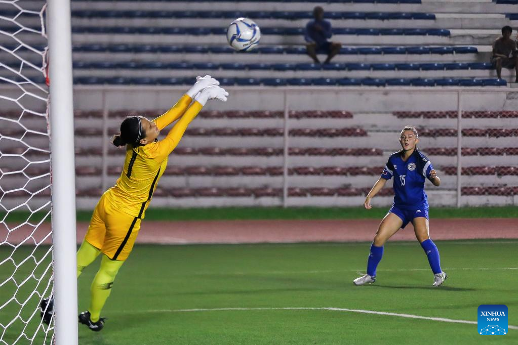 Singapore's goalkeeper Noor Kusumawati Mohammad Rosman (L) saves the ball during the AFF Women's Championship 2022 Group A match between the Philippines and Singapore in Manila, the Philippines on July 6, 2022. (Xinhua/Rouelle Umali)