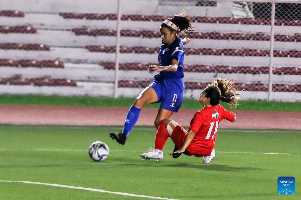 The Philippines' Ancka Chabeli Arrieta Castaneda (L) and Singapore's Putri Nur Syaliza Sazali (R) vie for the ball during the AFF Women's Championship 2022 Group A match between the Philippines and Singapore in Manila, the Philippines on July 6, 2022. (Xinhua/Rouelle Umali)