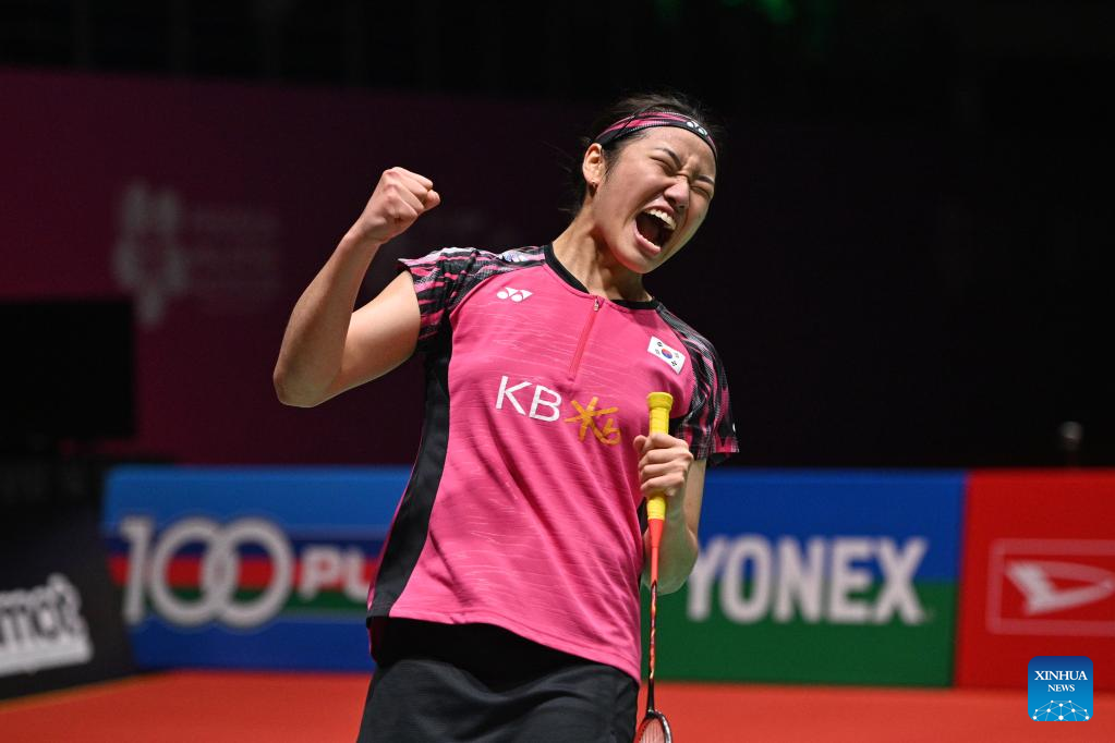 South Korea's An Se Young celebrates after winning the women's singles final match against China's Chen Yufei at Malaysia Masters 2022 in Kuala Lumpur, Malaysia, July 10, 2022. (Photo by Chong Voon Chung/Xinhua)
