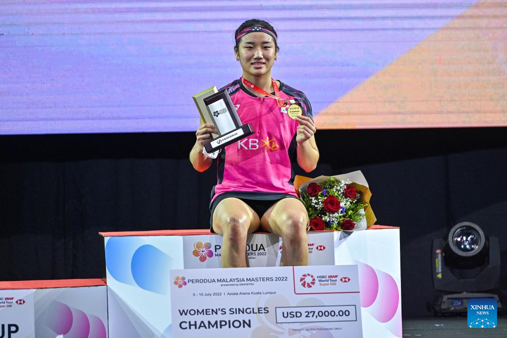 South Korea's An Se Young poses for photos during the awarding ceremony for the women's singles event at the Malaysia Masters 2022 in Kuala Lumpur, Malaysia, July 10, 2022. (Photo by Chong Voon Chung/Xinhua)