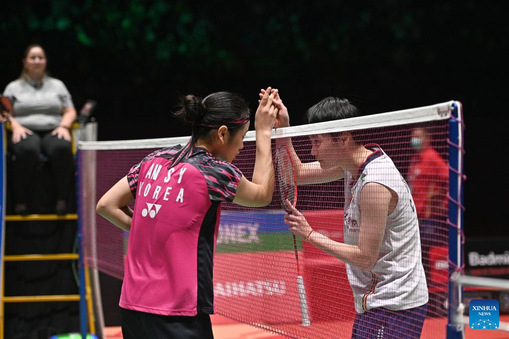 South Korea's An Se Young (L) and China's Chen Yufei greet each other after their women's singles final match at Malaysia Masters 2022 in Kuala Lumpur, Malaysia, July 10, 2022. (Photo by Chong Voon Chung/Xinhua)
