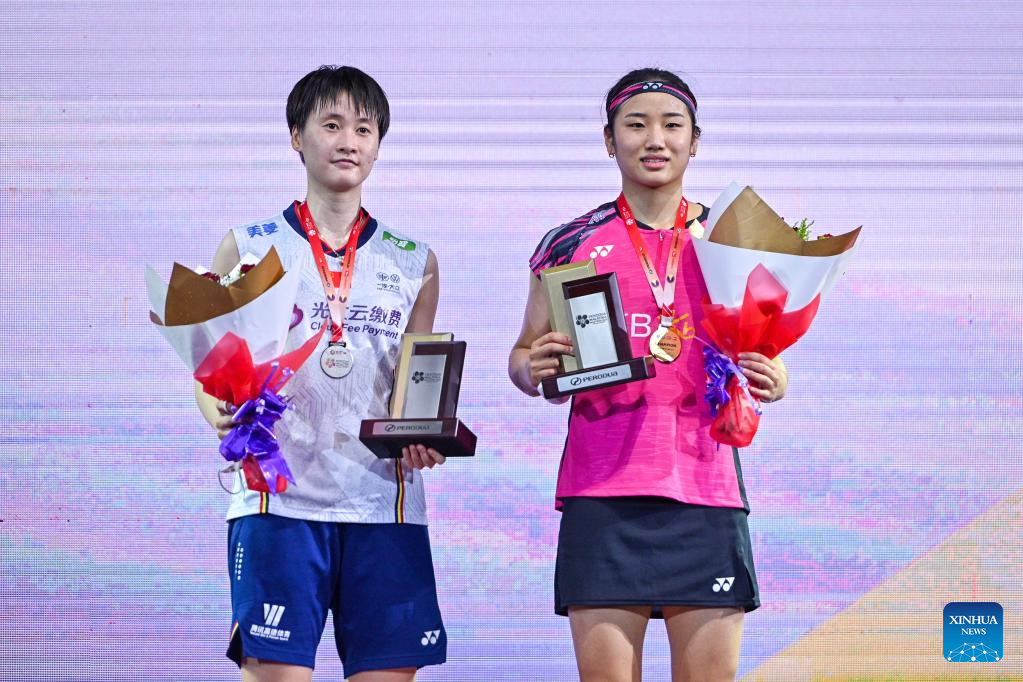 South Korea's An Se Young (R) and China's Chen Yufei pose for photos during the awarding ceremony for the women's singles event at the Malaysia Masters 2022 in Kuala Lumpur, Malaysia, July 10, 2022. (Photo by Chong Voon Chung/Xinhua)