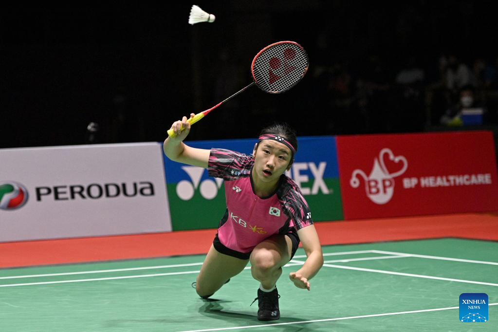 South Korea's An Se Young hits a return during the women's singles final match against China's Chen Yufei at Malaysia Masters 2022 in Kuala Lumpur, Malaysia, July 10, 2022. (Photo by Chong Voon Chung/Xinhua)
