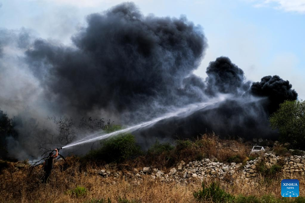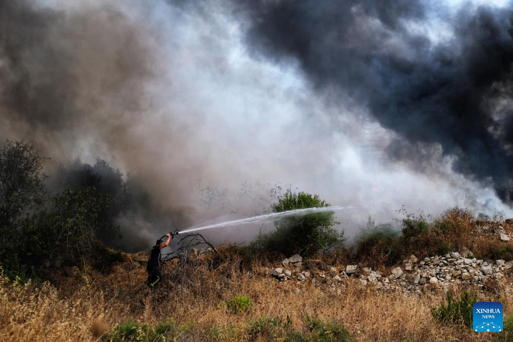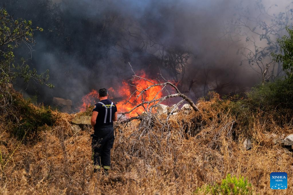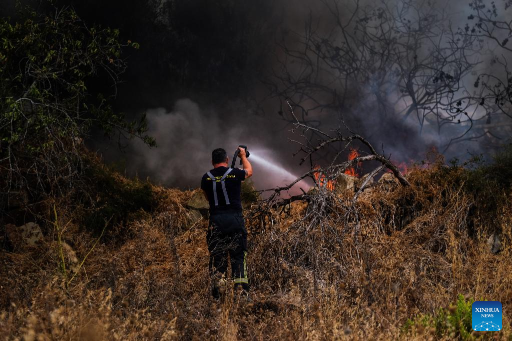 A firefighter battles a wildfire in Iklin, a small town in central Malta, on July 10, 2022. A wildfire took place in Iklin on Sunday afternoon. (Photo by Jonathan Borg/Xinhua)