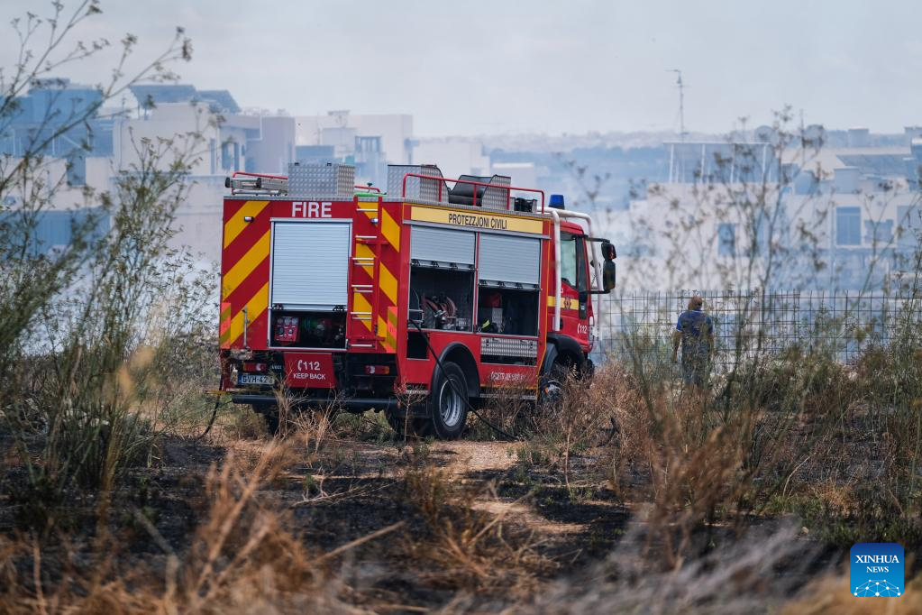 A fire truck is seen at a field in Iklin, a small town in central Malta, on July 10, 2022. A wildfire took place in Iklin on Sunday afternoon. (Photo by Jonathan Borg/Xinhua)