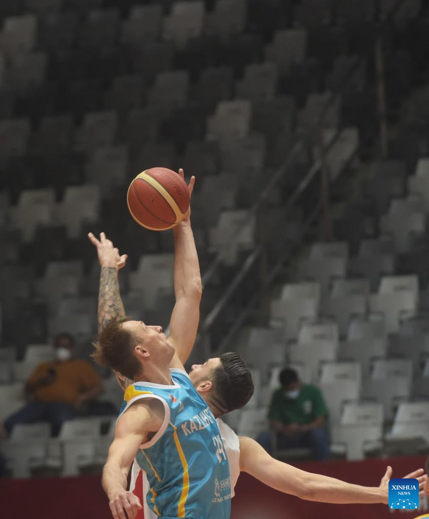 Dmitriy Gavrilov of Kazakhstan jumps for the ball against Luke Evans of Japan during their Group C match at the FIBA Asia Cup 2022 in Jakarta, Indonesia, July 13, 2022. (Xinhua/Zulkarnain)