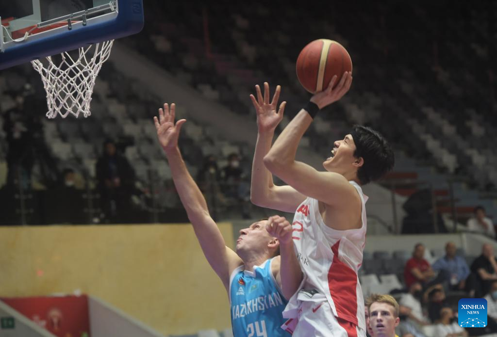 Watanabe Yuta (R) of Japan goes up for a basket during a Group C match against Kazakhstan at the FIBA Asia Cup 2022 in Jakarta, Indonesia, July 13, 2022. (Xinhua/Zulkarnain)