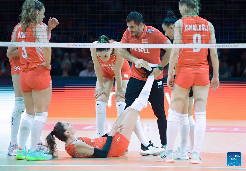 Hande Baladin (C) of Turkey receives medical help during the 2022 FIVB Volleyball Women's Nations League quarterfinal match between Turkey and Thailand in Ankara, Turkey, July 14, 2022. (Xinhua/Shadati)