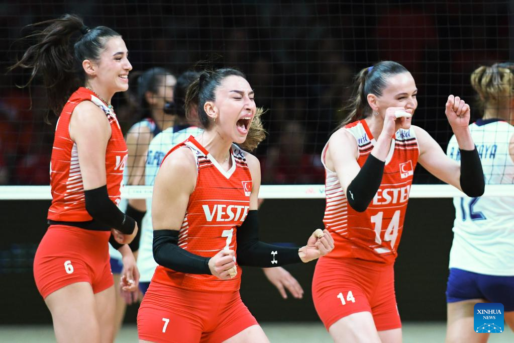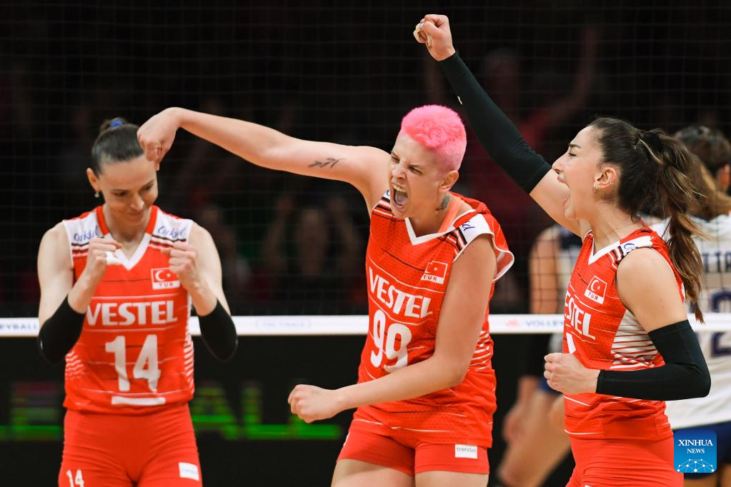 Players of Turkey celebrate after winning the 2022 FIVB Volleyball Women's Nations League quarterfinal match between Turkey and Thailand in Ankara, Turkey, July 14, 2022. (Xinhua/Shadati)