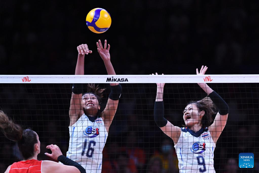 Players of Thailand celebrates scoring during the 2022 FIVB Volleyball Women's Nations League quarterfinal match between Turkey and Thailand in Ankara, Turkey, July 14, 2022. (Xinhua/Shadati)