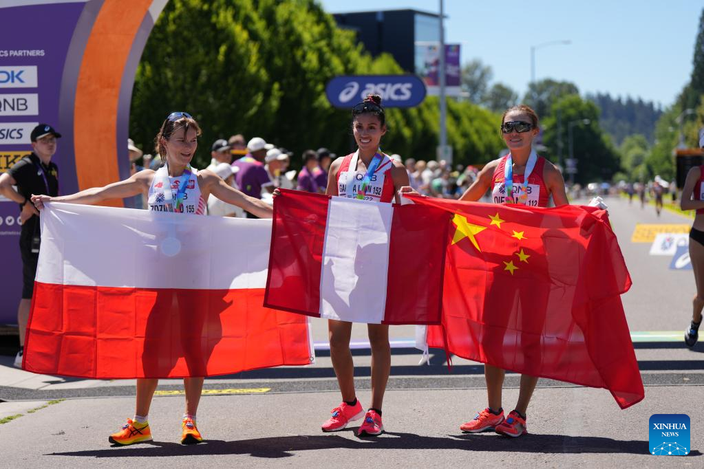 Gold medalist Kimberly Garcia Leon (C) of Peru celebrates with silver medalist Katarzyna Zdzieblo (L) of Poland and bronze medalist Qieyang Shijie of China after the women's 20km Race Walk final at the World Athletics Championships Oregon22 in Eugene, Oregon, the United States, July 15, 2022. (Xinhua/Wang Ying)