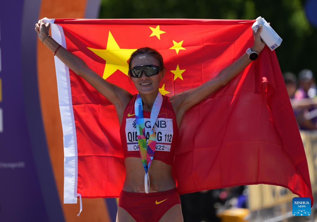 Bronze medalist Qieyang Shijie of China celebrates after the women's 20km Race Walk final at the World Athletics Championships Oregon22 in Eugene, Oregon, the United States, July 15, 2022. (Xinhua/Wang Ying)