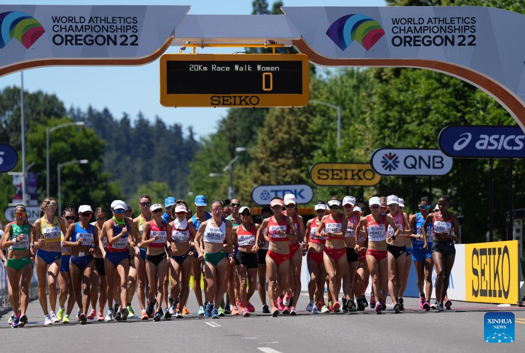 Racers start during the women's 20km Race Walk final at the World Athletics Championships Oregon22 in Eugene, Oregon, the United States, July 15, 2022. (Xinhua/Wang Ying)