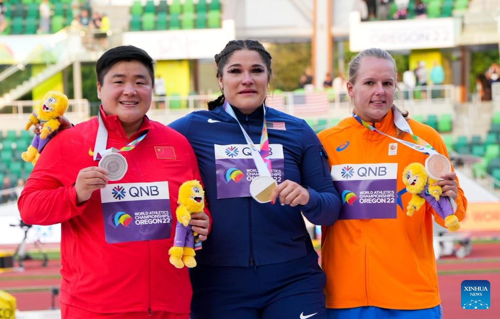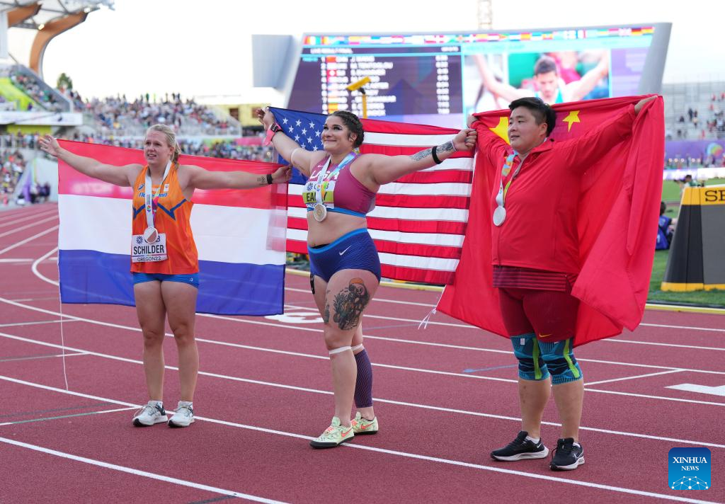Gold medalist Chase Ealey (C) of the United States, silver medalist Gong Lijiao (L) of China and bronze medalist Jessica Schilder of the Netherlands pose for photograph during the awarding ceremony of women's shot put at the World Athletics Championships Oregon22 in Eugene, Oregon, the United States, July 16, 2022. (Xinhua/Wang Ying)