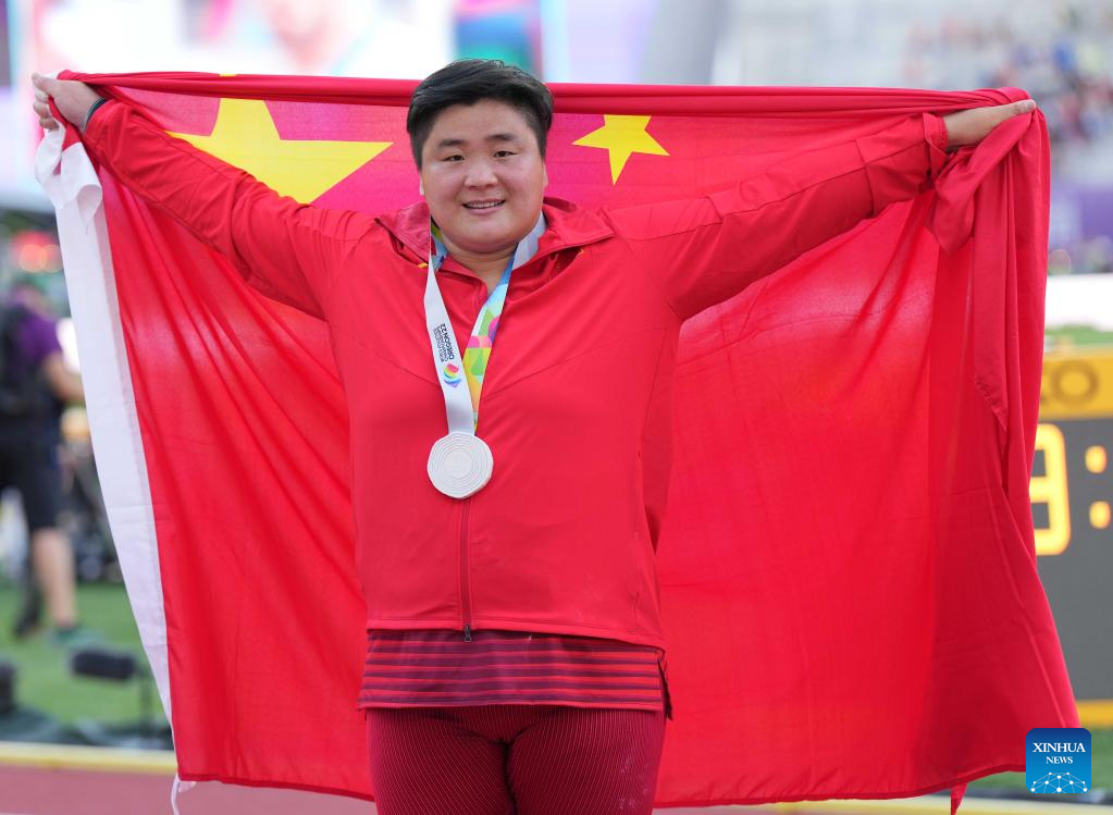 Gong Lijiao of China celebrates after the women's shot put final at the World Athletics Championships Oregon22 in Eugene, Oregon, the United States, July 16, 2022. (Xinhua/Wang Ying)