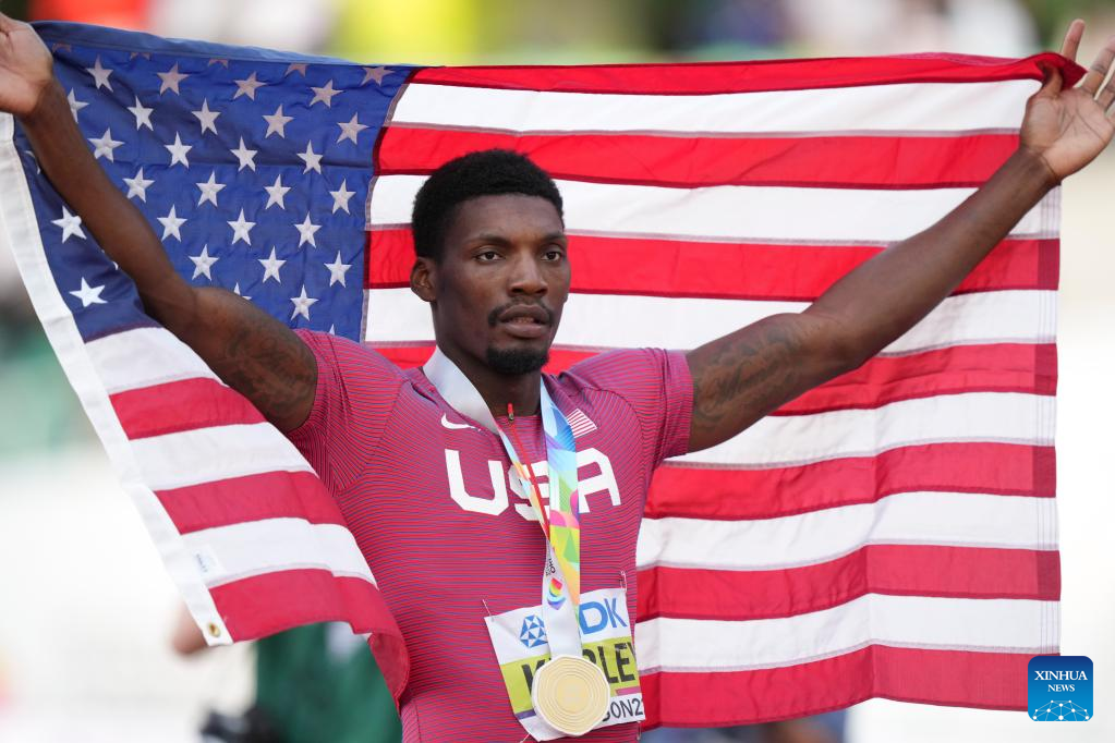 Fred Kerley of the United States celebrates after the men's 100m final at the World Athletics Championships Oregon22 in Eugene, Oregon, the United States, July 16, 2022. (Xinhua/Wang Ying)