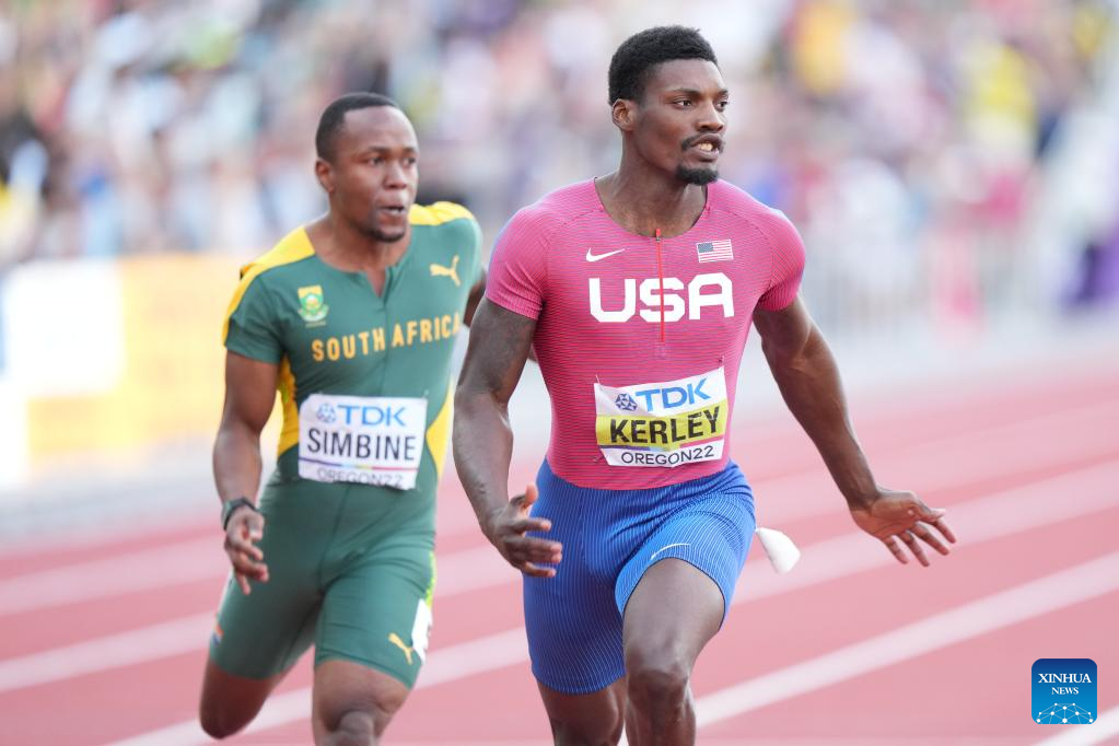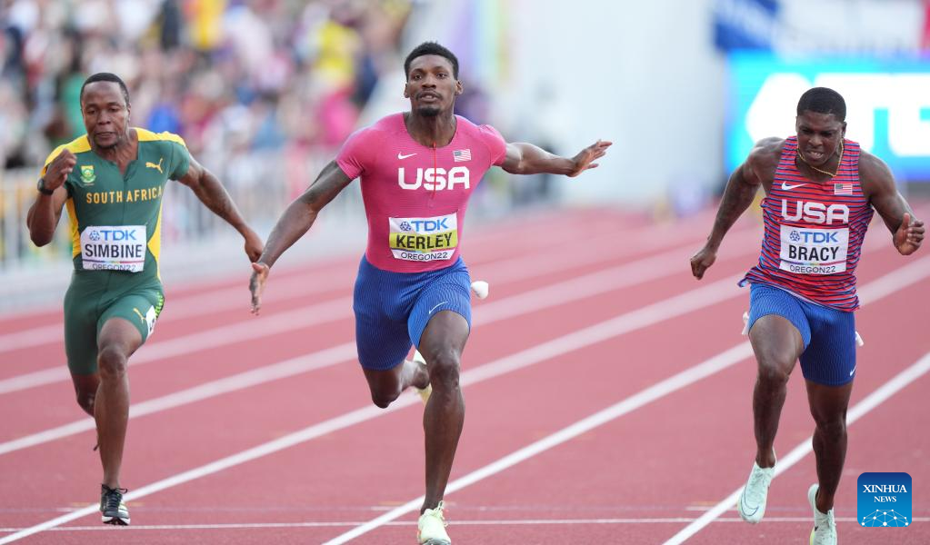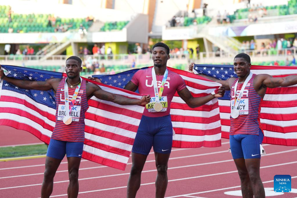 Marvin Bracy of the United States, Fred Kerley of the United States and Akani Simbine of South Africa (R to L) cross the finish line during the men's 100m final at the World Athletics Championships Oregon22 in Eugene, Oregon, the United States, July 16, 2022. (Xinhua/Wang Ying)