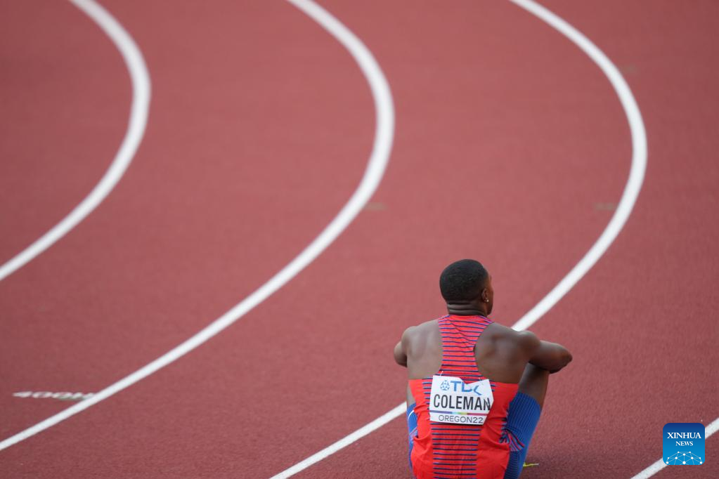 Christian Coleman of the United States looks on after the men's 100m final at the World Athletics Championships Oregon22 in Eugene, Oregon, the United States, July 16, 2022. (Xinhua/Wu Xiaoling)