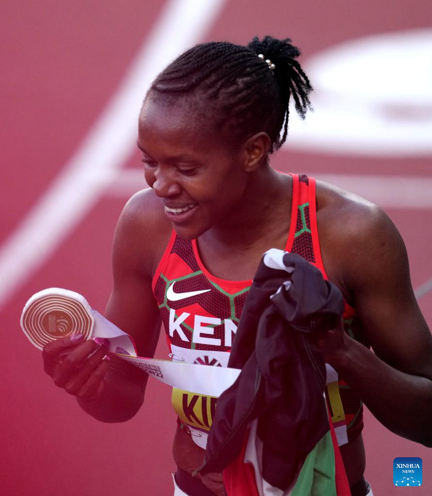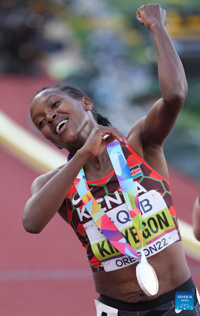 Kenya's Faith Kipyegon celebrates after the women's 1500m final at the World Athletics Championships Oregon22 in Eugene, Oregon, the United States, July 18, 2022. (Xinhua/Wu Xiaoling)