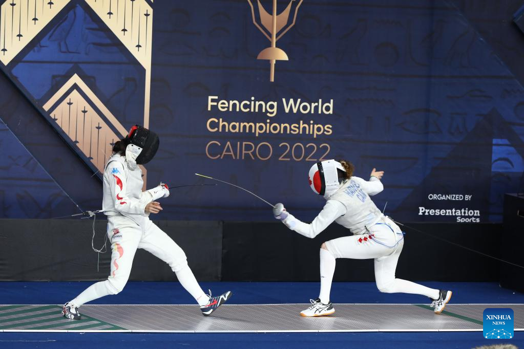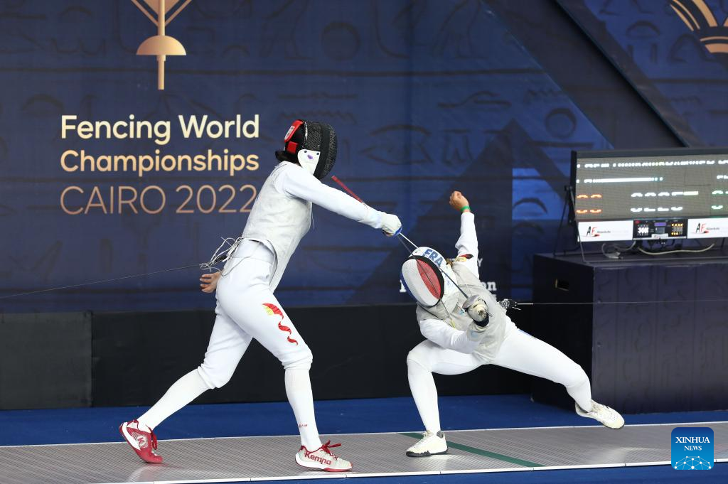 Shi Yue (L) of China competes against Anita Blaze of France during their women's Foil Individual Table of 32 match at the 2022 Fencing World Championships in Cairo, Egypt, July 19, 2022. (Xinhua/Ahmed Gomaa)