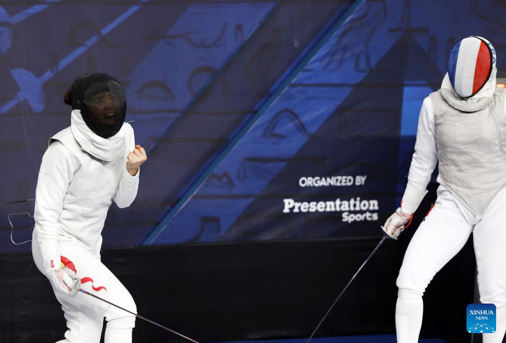 Shi Yue (L) of China celebrates during the women's Foil Individual Table of 32 match against Anita Blaze of France at the 2022 Fencing World Championships in Cairo, Egypt, July 19, 2022. (Xinhua/Ahmed Gomaa)
