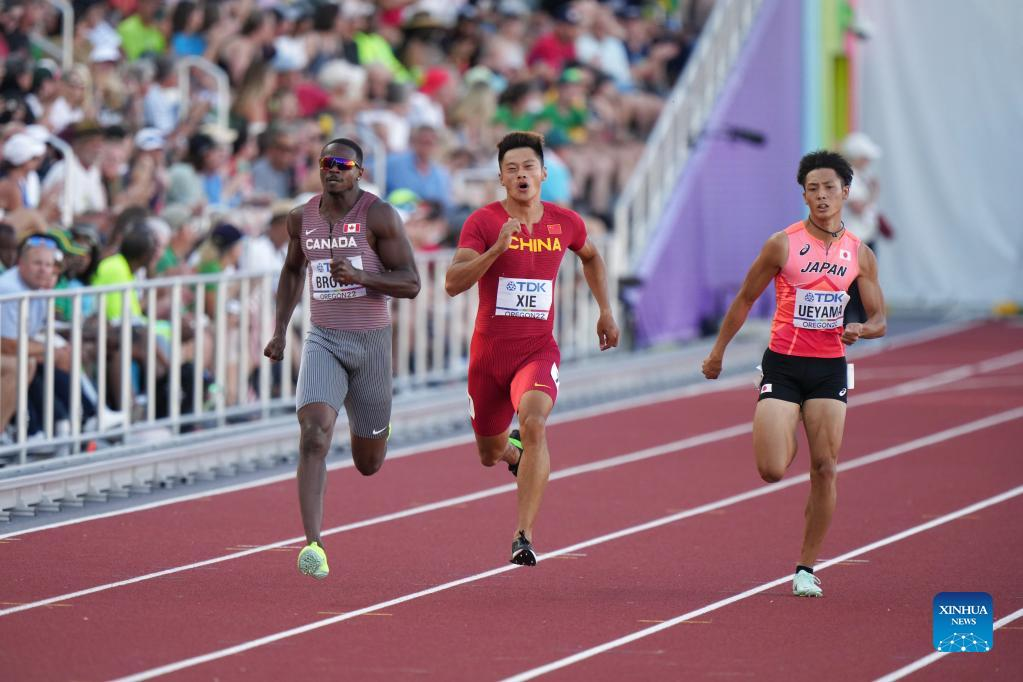 Aaron Brown of Canada, Xie Zhenye of China and Ueyama Koki of Japan (L to R) sprint during the men's 200m semifinal at the World Athletics Championships Oregon22 in Eugene, Oregon, the United States, July 19, 2022. (Xinhua/Wang Ying)