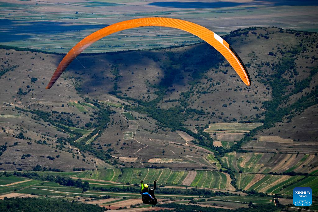 A pilot flies the paraglider during the 2022 Paragliding World Cup in Krushevo, North Macedonia, on July 20, 2022. The event is held here from July 14 to 21, 2022. (Photo by Tomislav Georgiev/Xinhua)