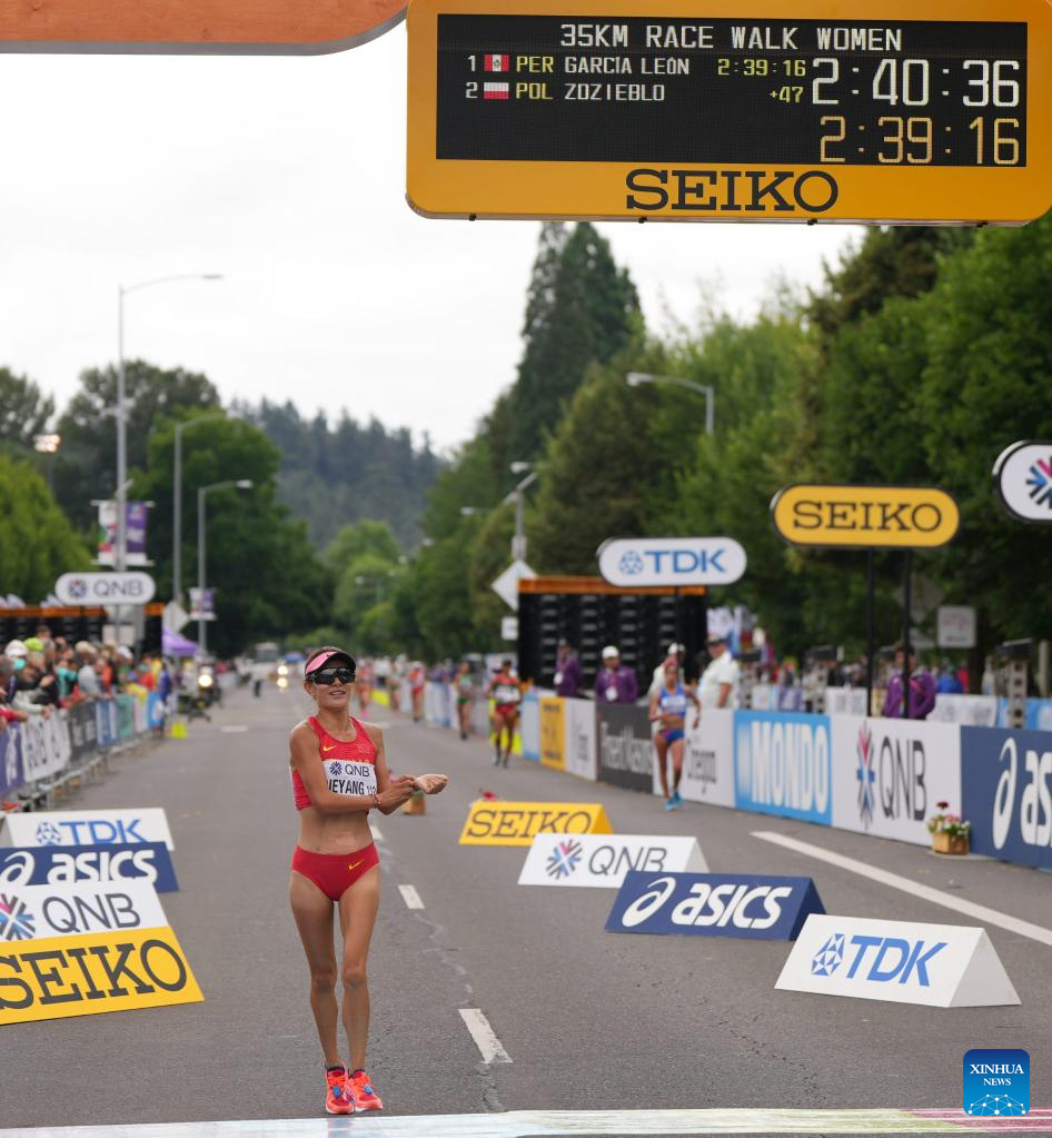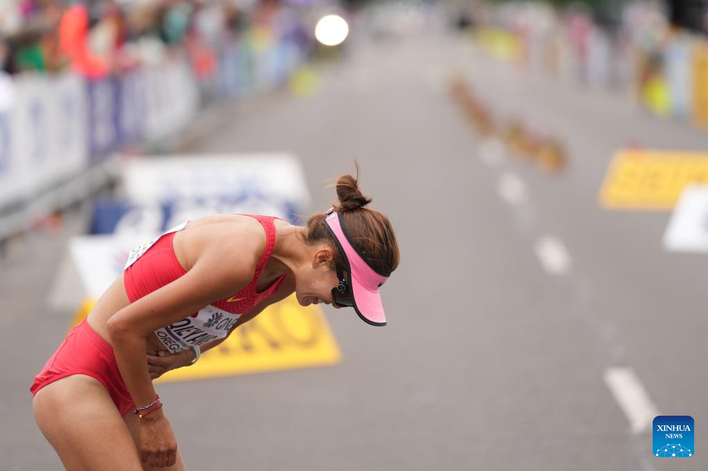 Qieyang Shijie of China reacts after the women's 35km Race Walk final at the World Athletics Championships Oregon22 in Eugene, Oregon, the United States, July 22, 2022. (Xinhua/Wu Xiaoling)