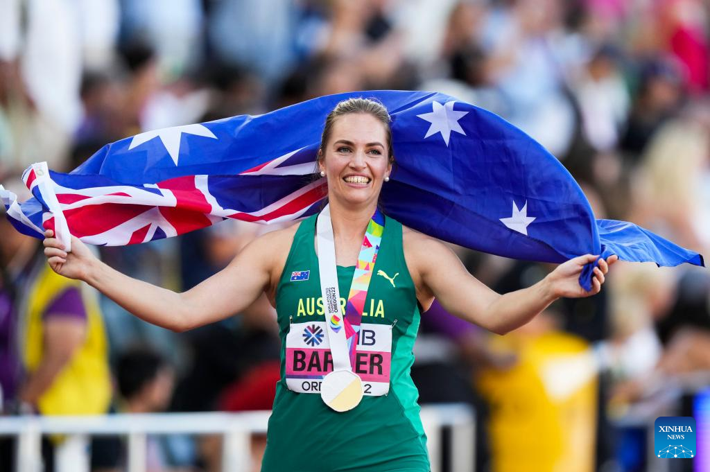 Kelsey-Lee Barber of Australia celebrates after the women's javelin throw final at the World Athletics Championships Oregon22 in Eugene, Oregon, the United States, July 22, 2022. (Xinhua/Wang Ying)