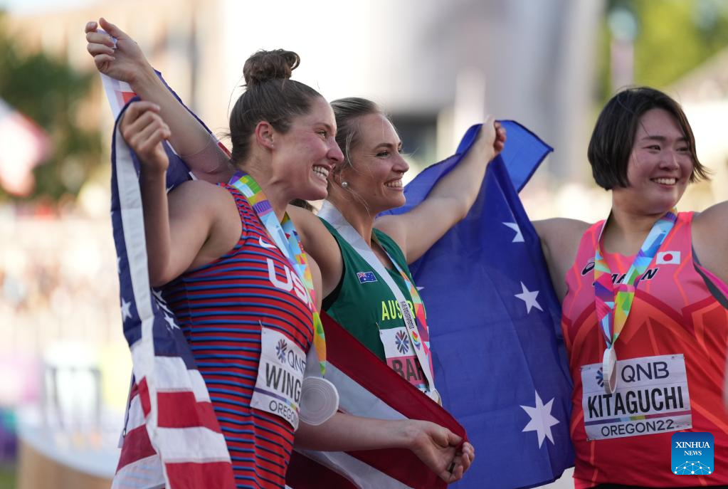 Kelsey-Lee Barber (C) of Australia, Kara Winger (L) of the United States and Kitaguchi Haruka of Japan celebrate after the women's javelin throw final at the World Athletics Championships Oregon22 in Eugene, Oregon, the United States, July 22, 2022. (Xinhua/Wu Xiaoling)