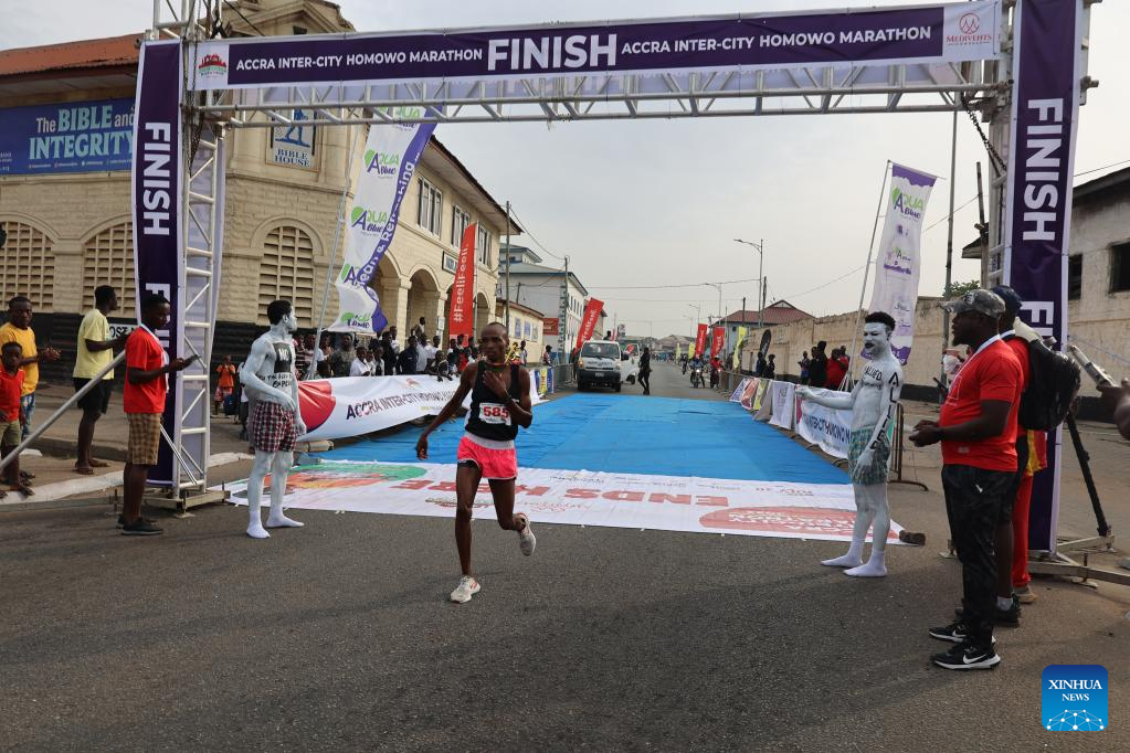 An athlete crosses the finish line in the first inter-city marathon in Accra, Ghana, on July 30, 2022. (Photo by Seth/Xinhua)