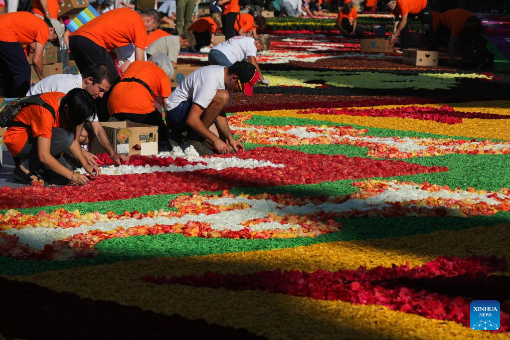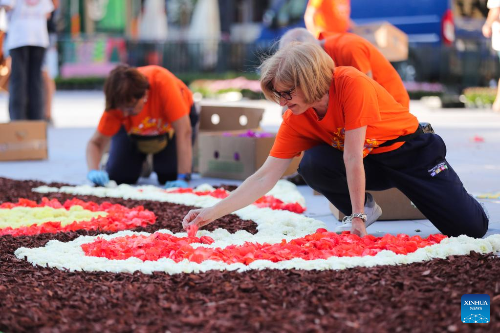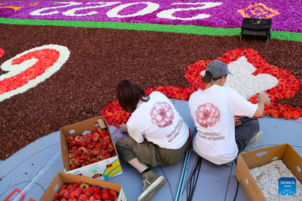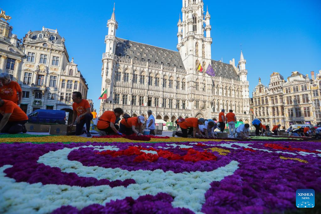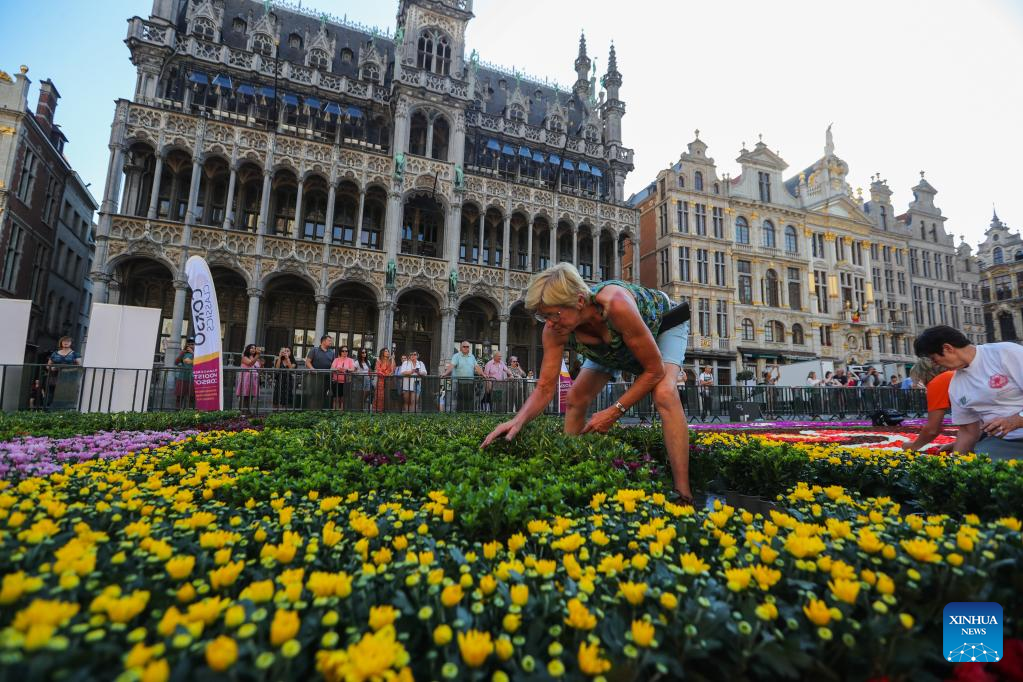 People prepare the flower carpet at the Grand Place in Brussels, Belgium, Aug. 12, 2022. After the cancellation of the Flower Carpet 2020 due to the COVID-19 pandemic, the traditional festival returned to Brussels from August 12 to 15, 2022. The theme of the Flower Carpet 2022 is "50th Anniversary of the Brussels Flower Carpet". Artists reinterpret the design of the pattern of the first flower carpet in 1971, using about 140,000 begonias, 225,000 dahlias, dyed bark, rolls of turf, chrysanthemums and euonymus. (Xinhua/Zheng Huansong)