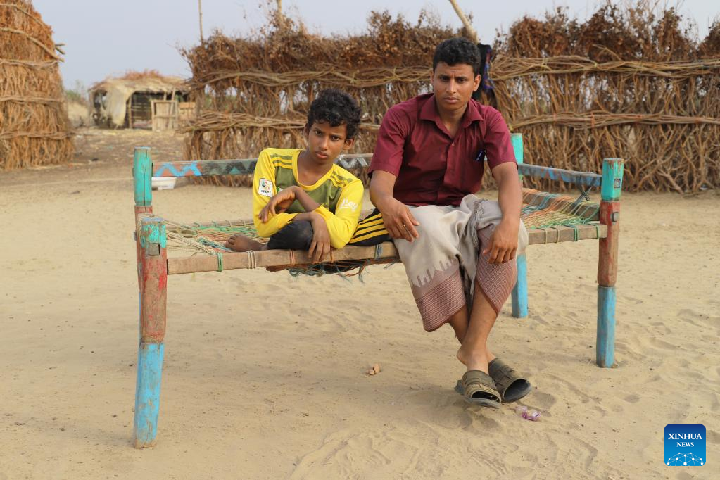 Hasan al-Jaeyedi (R), who was hurt and paralysed by shrapnel from a projectile, sits on the ground in front of his family's hut in Midi District, Hajjah Province, Yemen, on Aug. 13, 2022. Hasan al-Jaeyedi, a Yemeni boy, has been largely confined to bed since shrapnel from a projectile during a military attack more than six years ago hurt his head and spine and paralysed him. (Photo by Mohammed Mohammed/Xinhua)