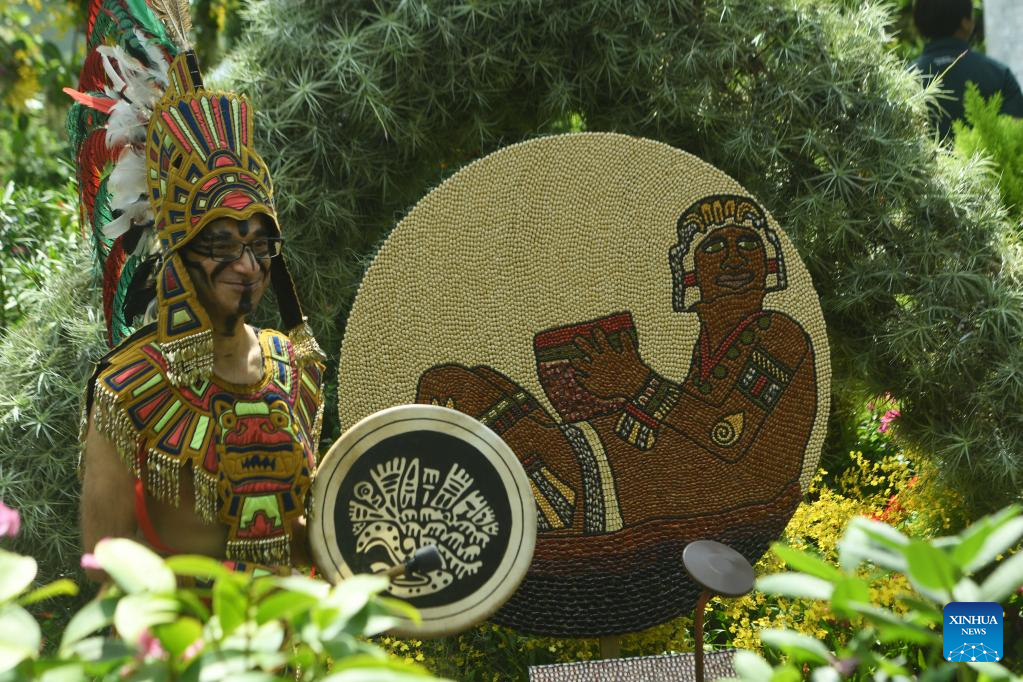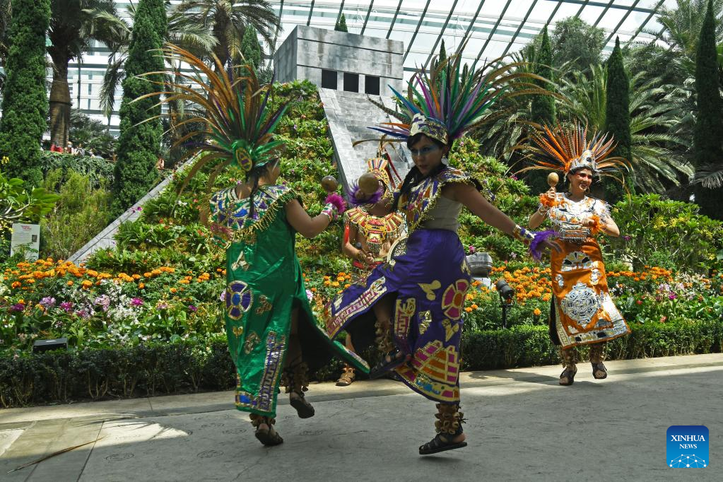 Traditionally-dressed Mexican dancers perform on the opening day of "Hanging Gardens - Mexican Roots" floral display, held at Flower Dome of the Singapore's Gardens by the Bay on Aug. 19, 2022. (Xinhua/Then Chih Wey)