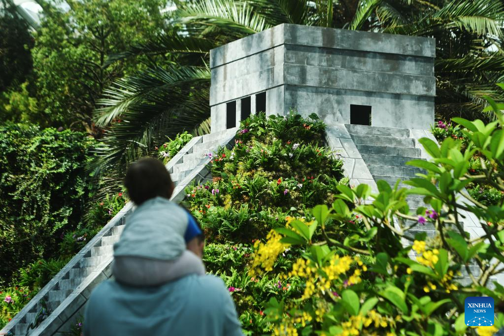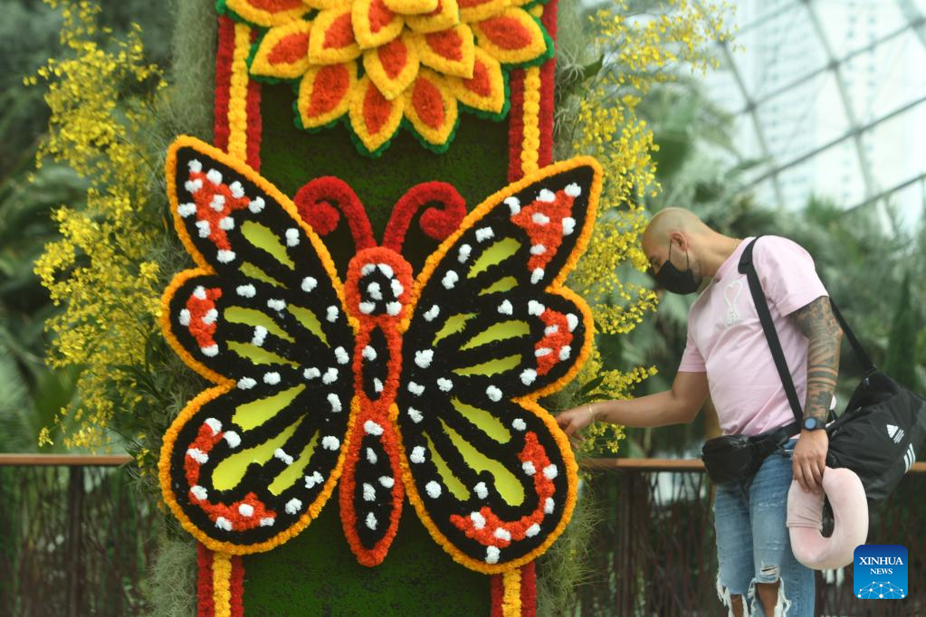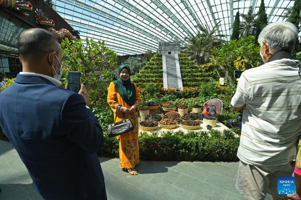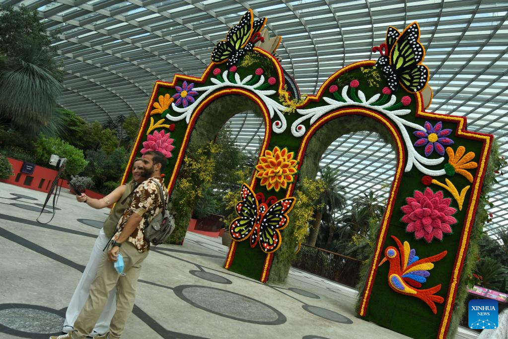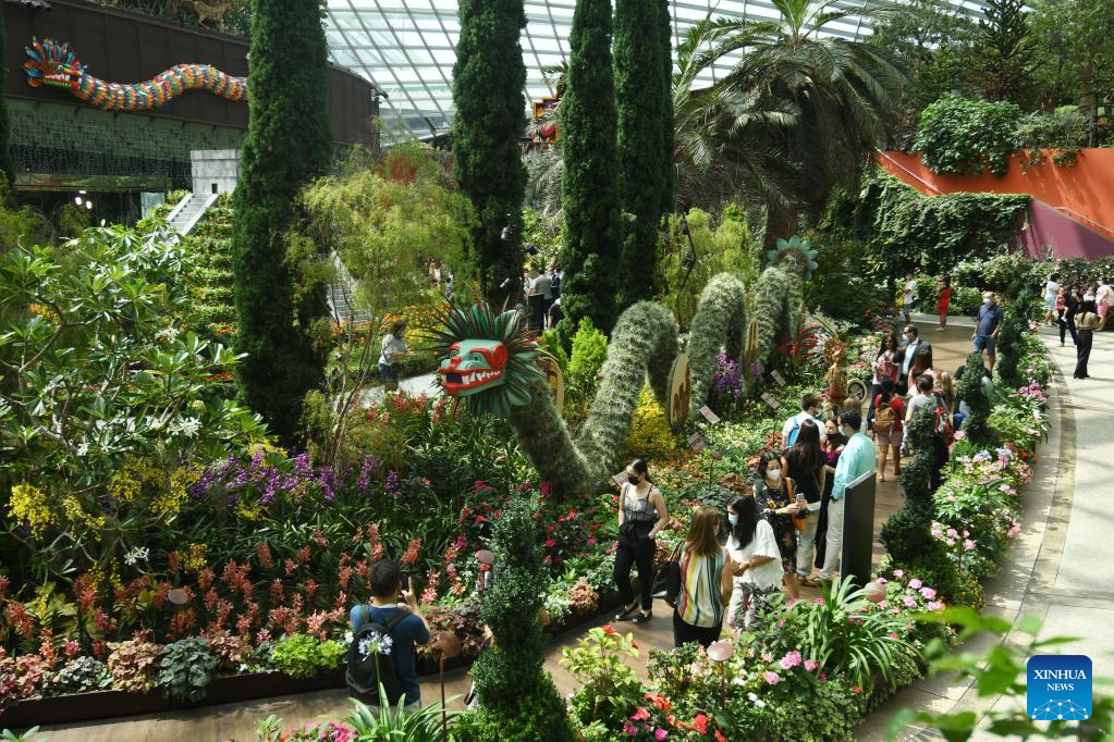 Tourists view the floral and cultural exhibits during the opening day of "Hanging Gardens - Mexican Roots" floral display, held at Flower Dome of the Singapore's Gardens by the Bay on Aug. 19, 2022. (Xinhua/Then Chih Wey)