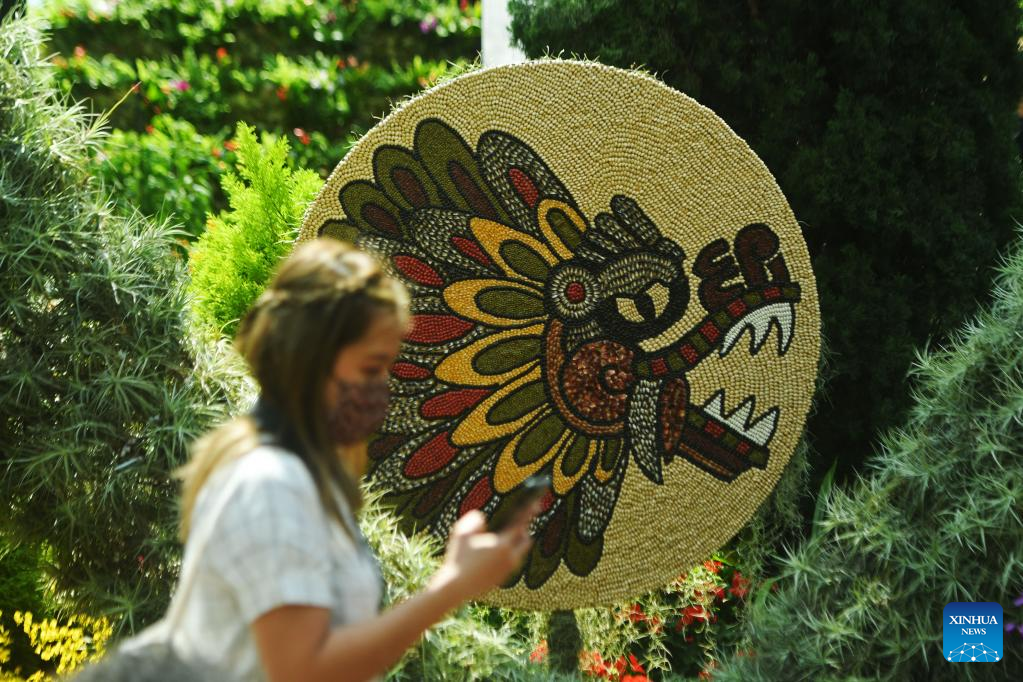 A seed mosaic art medallion is displayed during the opening day of "Hanging Gardens - Mexican Roots" floral display, held at Flower Dome of the Singapore's Gardens by the Bay on Aug. 19, 2022. (Xinhua/Then Chih Wey)