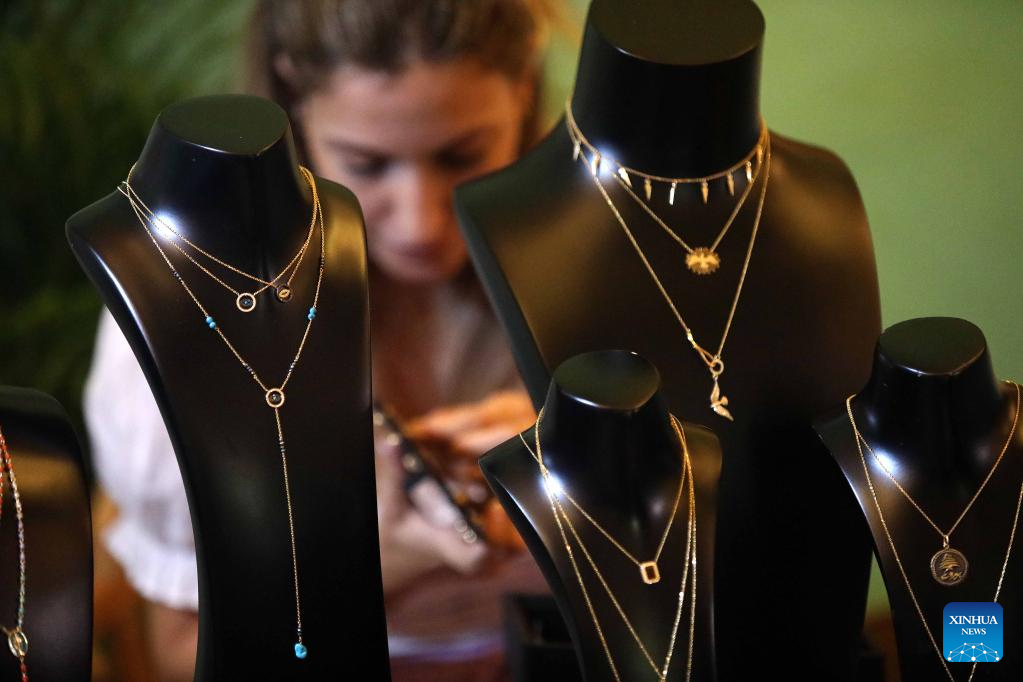 Handicrafts are displayed at the exhibition "I Love You Lebanon" in Beirut, Lebanon, Aug. 24, 2022. Young Lebanese fashion designers participated on Wednesday in a yearly exhibition in Beirut, which was held to encourage local talents to develop their business against the economic difficulties in the country. (Xinhua/Bilal Jawich)