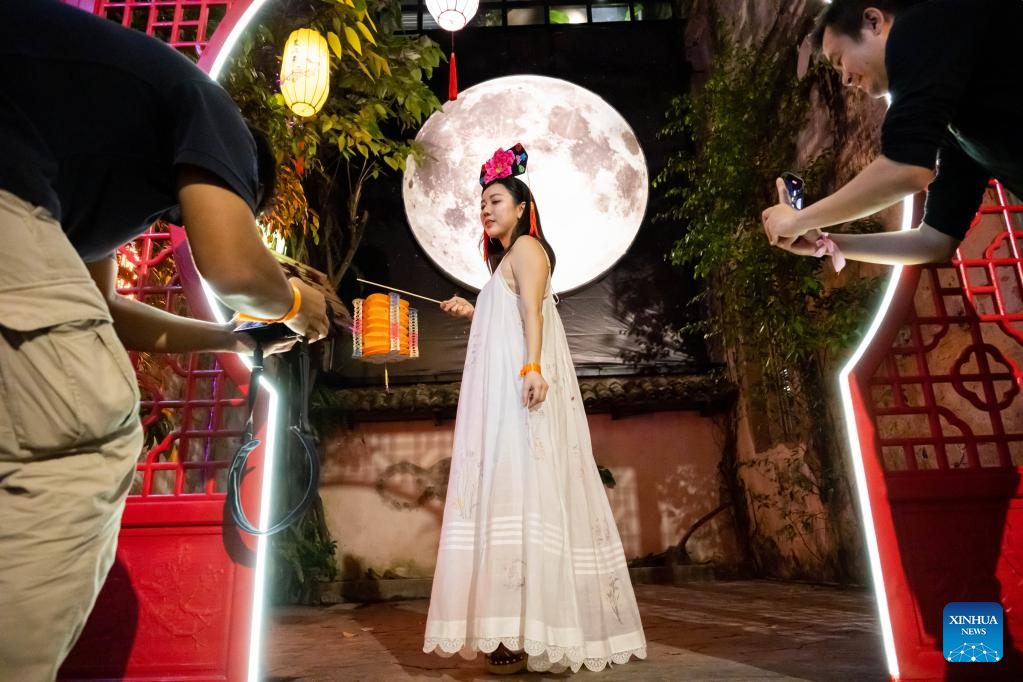 A woman poses for photos as she visits the "Beyond the Moonlit Door" art installation show during a media preview at Kwai Chai Hong in Kuala Lumpur, Malaysia on Aug. 25, 2022. The art installation show "Beyond the Moonlit Door" will be open to the public from Aug. 26 to Oct. 2 in celebration of Mid-Autumn Festival. (Xinhua/Zhu Wei)