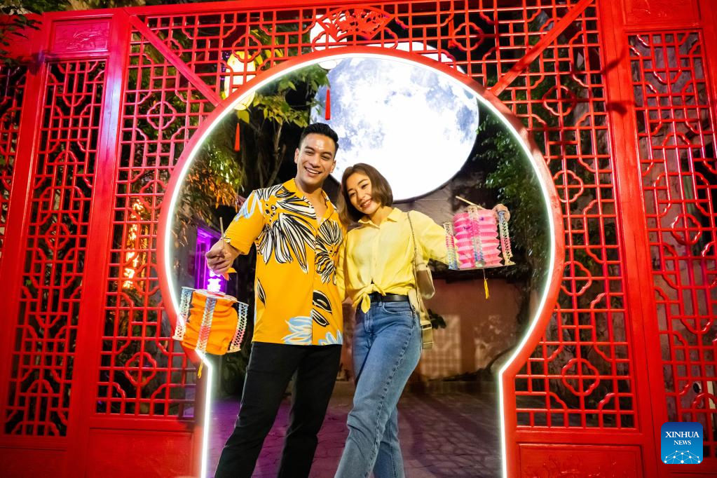 People pose for photos as they visit the "Beyond the Moonlit Door" art installation show during a media preview at Kwai Chai Hong in Kuala Lumpur, Malaysia on Aug. 25, 2022. The art installation show "Beyond the Moonlit Door" will be open to the public from Aug. 26 to Oct. 2 in celebration of Mid-Autumn Festival. (Xinhua/Zhu Wei)
